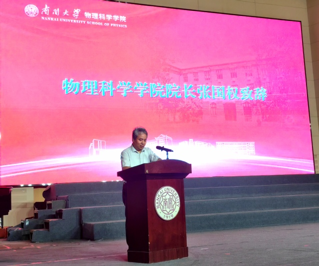 张国权向全体新生致以热烈欢迎,并带领同学们回顾了南开物理创建以来的百年历程,讲述了杰出校友事迹,解读了南开精神与南开品格。他从“善思笃学 格物致理”八个字出发,勉励新生要成长为善思明辨的思考者、勤勉向学的追光者、躬身实践的探索者,将理论学习与实践结合,在南开深厚的学术底蕴和优质资源中成长成才,为国家发展和民族复兴贡献青春力量。